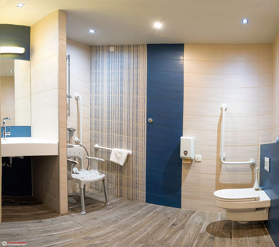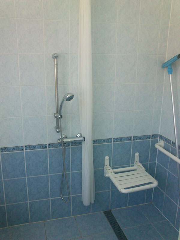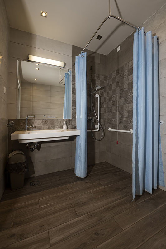| Prilagojena kopalnica | Vse kopalnice so primerno prilagojene in prostorne, vsebujejo oprijemala, tuš brez roba, pod tušem pa stol za presedanje. |