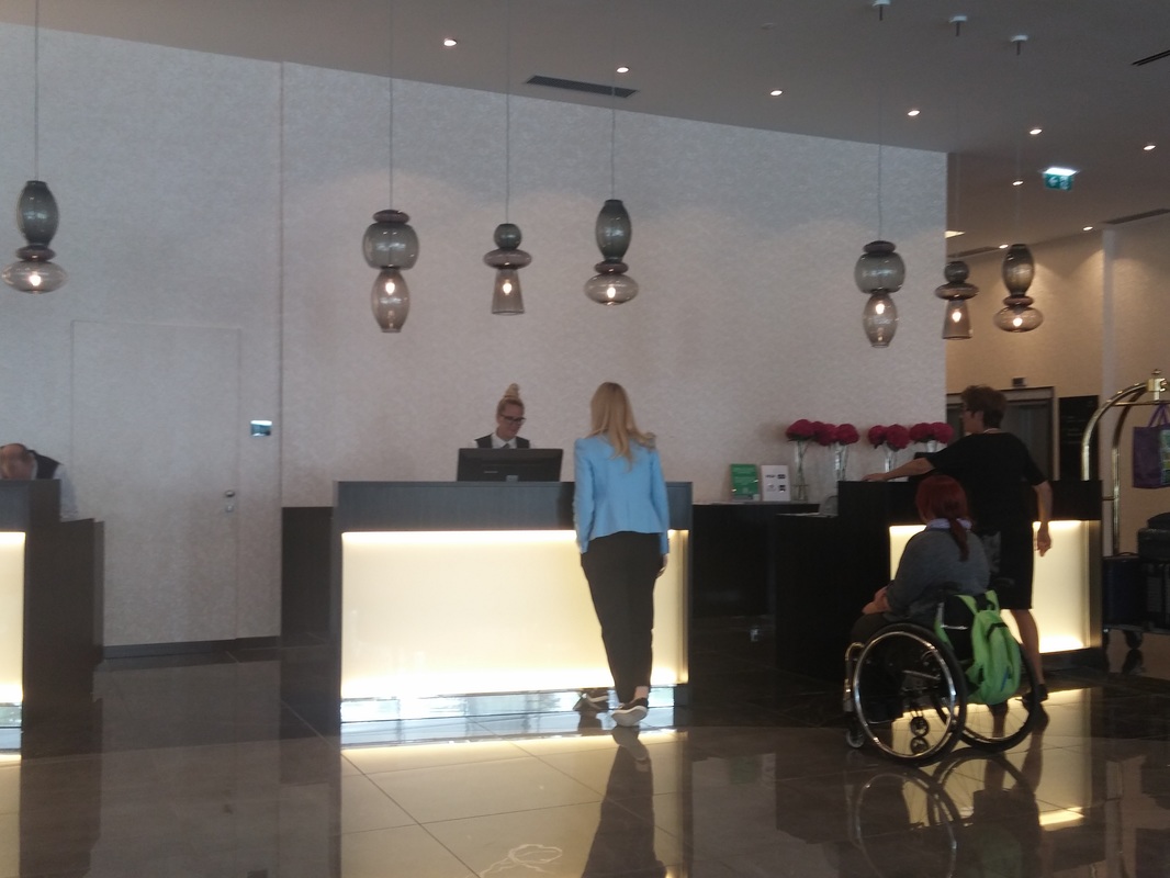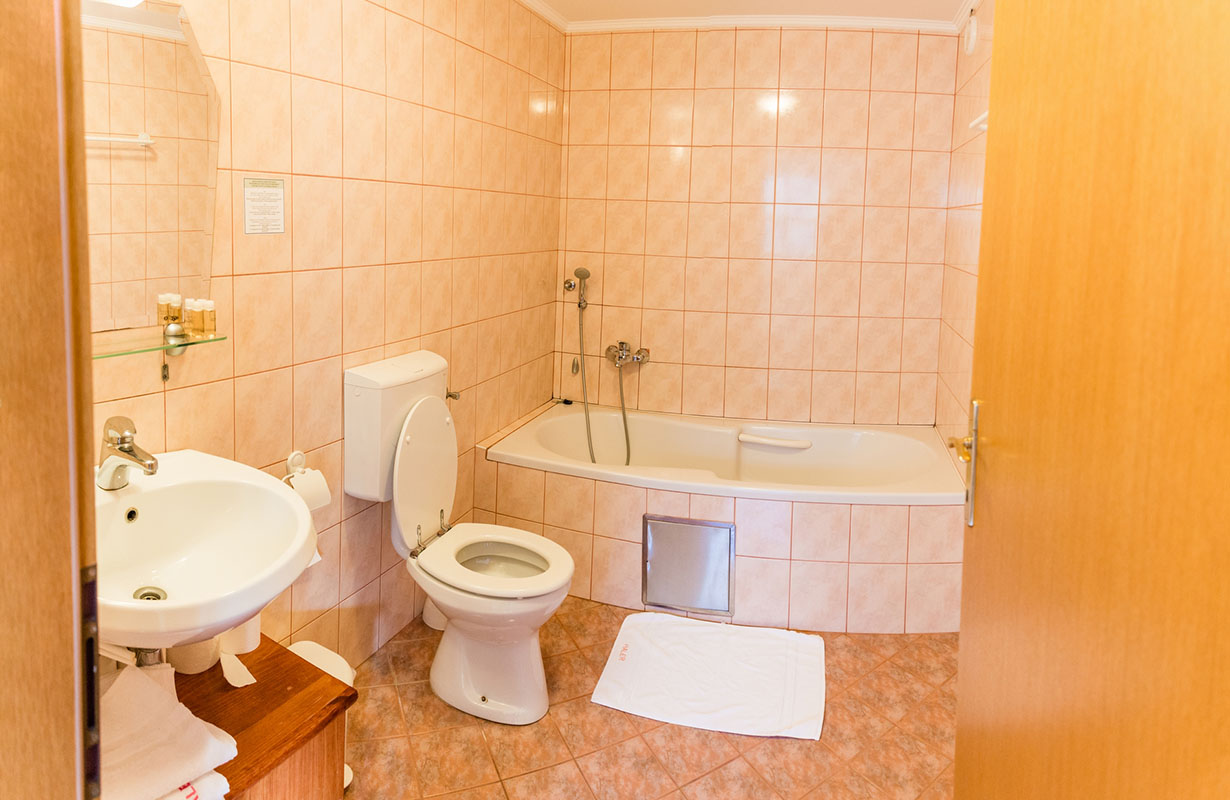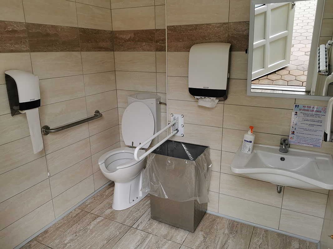 | Prilagojena kopalnica | Kopalnica v sobi vsebuje kad, v njej pa je tudi plastični stolček. Žal večinoma nima oprijemal. Prilagojeno splošno invalidsko stranišče se nahaja tudi v restavraciji. |