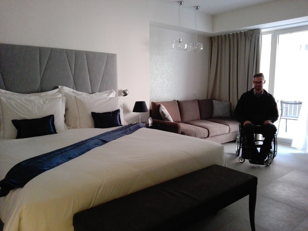 Dostopna soba | Soba je ogromna in omogoča dovolj prostora tudi uporabnikom električnih vozičkov. Edina manjša ovira je dostop na balkon, saj imajo balkonska vrata visok rob. |