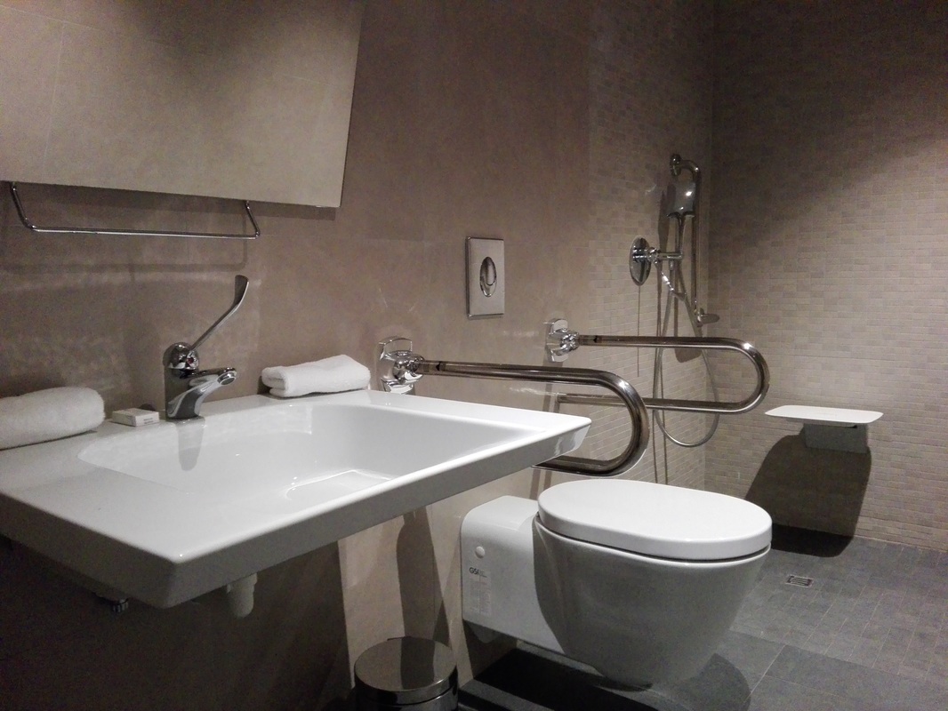 Prilagojena kopalnica | Soba nudi kar 2 kopalnici – ena je prilagojena invalidom, druga je namenjena spremljevalcem (dostop v običajno kopalnico je za osebe na invalidskih vozičkih otežen zaradi stopničke). V spodnjem delu hotela žal nimajo nobenega prilagojenega splošnega stranišča za invalide. |